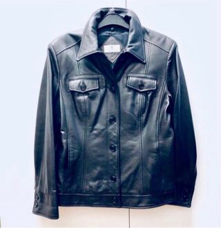 Cazadora de mujer. El cuero es auténtico, de calidad, grueso y resistente. El forro es acolchado. La chamarra está impecable por fuera y por dentro, incluido el cuello y los puños. Tiene dos pequeños bolsillos en la parte superior y otros dos en la inferior. La botonadura de presión y las cremalleras están intactas. Es una talla S/M.
