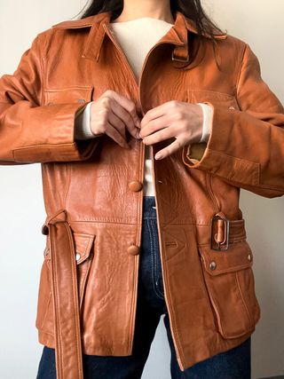CAZADORA DE PIEL 100% ESTILO VINTAGE. Confeccion de alta calidad. - Forro interior. - Color ocre con 4 bolsillos y cinturón de ajuste en la cintura y cuellos. - Cierre con botones forrados. - Usada un par de veces, está en perfectas condiciones. Yo uso una 36 y me queda oversize. No tiene talla pero da para una 34-40. PREGUNTA SIN COMRPOMISO! ☺️