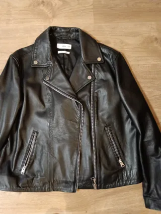 Cazadora de piel negra de Mango. - Diseño clásico. - Cremalleras plateadas. - Cuello con solapas. 100% piel Sirve para talla s tambien