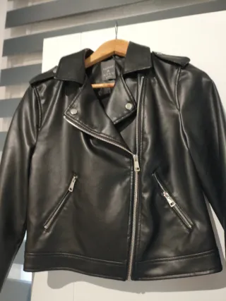 Cazadora de mujer con un diseño moderno y atemporal. Color negro. - Material: Piel sintética. - Cierre de cremallera. - Bolsillos con cremallera. Nueva, en perfecto estado.