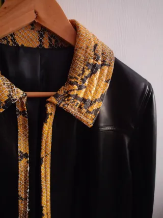 Elegante cazadora con detalles de piel y motivos de serpiente. - Diseño con cuello y paneles inferiores. - Cierre frontal.