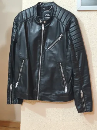 Cazadora de la marca Zara en color gris y negro Diseño moderno y versátil. - Material con acabado efecto piel. - Cierre de cremallera frontal. - Bolsillos laterales con cremallera.