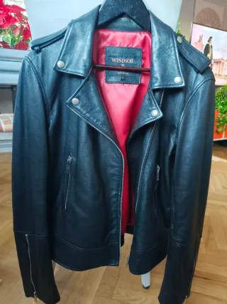 Elegante cazadora de piel con un forro interior de color rojo vibrante. Un clásico que no pasa de moda. Sin estrenar, ha sido regalo de Navidad y no me viene. - Diseño tipo biker. - Cremalleras doradas en bolsillos y puños. - Cuello con solapas y botones a presión.