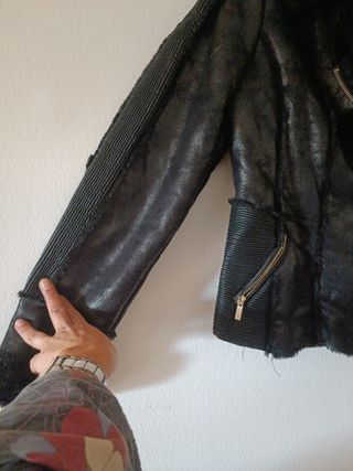 Cazadora confeccionada en tejido efecto piel. Cuello con solapas de pico y manga larga acabada en puño con cierre de cremallera. Bolsillos frontales con cierre de cremallera y detalle de bolsillo interior. Cierre frontal asimétrico con cremallera. La cazadora biker es un clásico inmortal y todo un icono de estilo. Desde looks informales hasta noches especiales, su versatilidad te permitirá llevarla temporada tras temporada. Su particular estilo te garantiza estar siempre en tendencia. Está nueva, jamás puesta. Se puede ver en las fotos de detalles con la etiqueta original intacta.