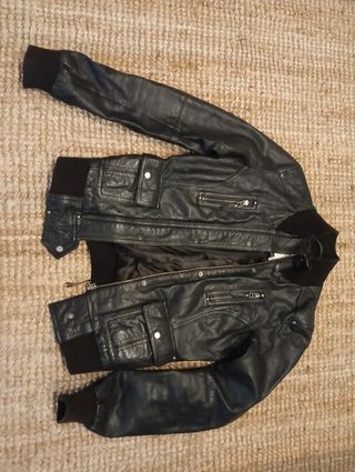 Marca Pepe Jeans, piel de verdad, talla L o 38-40. Tiene una raja en la parte delantera como puedes ver en la foto y marcas en la parte trasera.