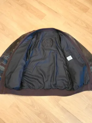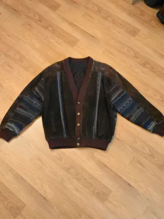 Hago descuento por lotes. Cazadora de piel con un diseño único y detalles étnicos. - 100% Piel auténtica y 70% lana. - Combinación de colores marrón y multicolor. - Cierre de botones. - Puños y bajo elásticos. - Le falta el adorno de un botón