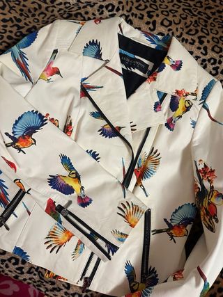 Cazadora de piel auténtica con un vibrante estampado de aves. - Diseño único y llamativo. - Cierre de cremallera frontal y en mangas. - Cuello solapa clásico.