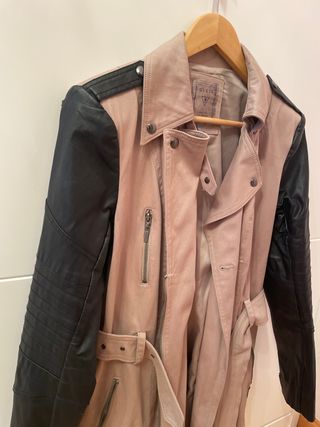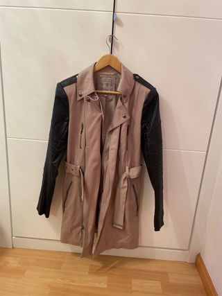 Cazadora de piel sintética con un diseño moderno y atemporal. - Cremalleras plateadas. - Cinturón ajustable en la cintura. - Puños con cremallera.