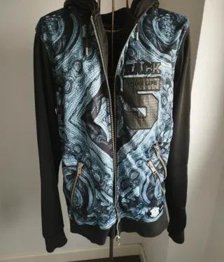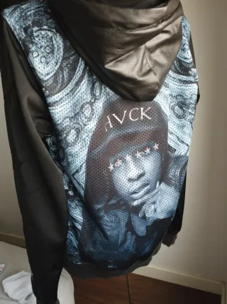 Cazadora con un diseño llamativo y moderno. - Estampado frontal en tonos azules y negros. - Mangas y capucha en color negro. - Cierre de cremallera. - Bolsillos laterales con cremallera.