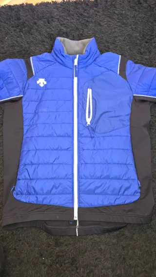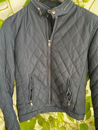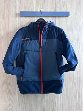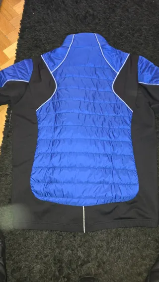 Cazadora híbrida con paneles acolchados en azul y mangas negras elásticas tipo neopreno. Cuello alto y bolsillo frontal con cremallera. - Paneles acolchados en la parte delantera. - Mangas y laterales en tejido negro. - Cremallera frontal completa en blanco. - Bolsillo en el pecho con cremallera. Usada 1 solo día.