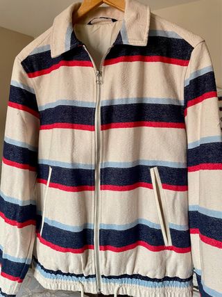 Cazadora de Zara con un diseño de rayas llamativo. Bolsillos laterales, cremallera y puños y bajo elástico.