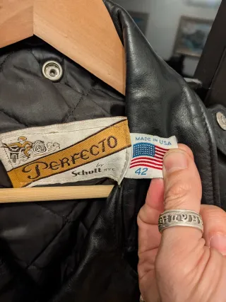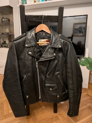 Cazadora de cuero clásica de la marca Schott. Una cazadora de colección, en un estado muy bueno, muy difícil de encontrar - Diseño tipo biker. - Cierre de cremallera. - Bolsillos frontales con cremallera y solapa. - Cuello con solapas y botones a presión. Medidas: Hombros 49cm Axilas 55 cm Largo costura cuello cintura 62cm Largo manga 60cm