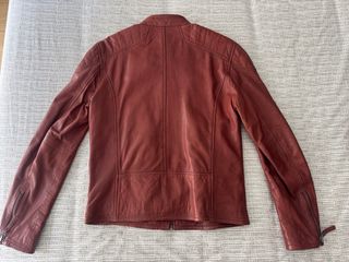 Cazadora de cuero en color rojo, talla M. Un básico para cualquier armario. - Diseño acolchado en hombros. - Cierre de cremallera frontal. - Bolsillos laterales con cremallera.