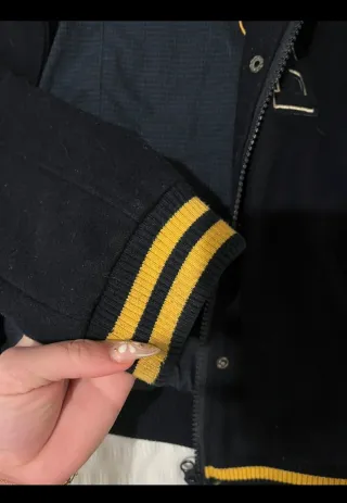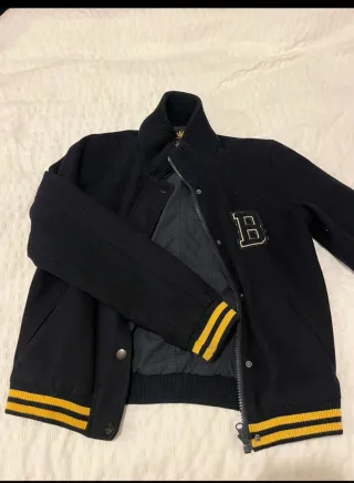 Cazadora estilo aviador con detalles en contraste.Marca talla M,pero yo diría que es una S - Cuello alto acanalado. - Cierre de cremallera. - Puños y bajo con bandas. - Parche con letra 'B' en el pecho.