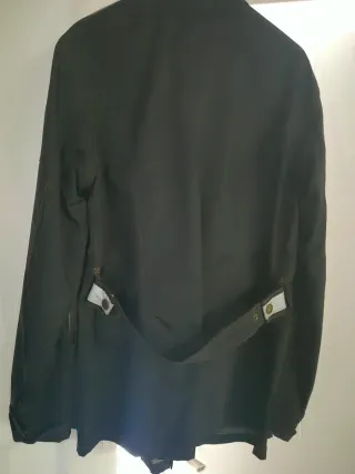 Chaqueta de la marca Belstaff en color negro y talla M. - Cierre frontal de cremallera y botones a presión. - Dos bolsillos superiores con solapa y botón. - Dos bolsillos inferiores con cremallera. - Detalle de cinturón ajustable en la cintura con hebilla. Marca: Belstaff Color: Negro Talla: Equivalente a la M En perfecto estado Por favor, abstenerse ofertas y preguntas absurdas: seriedad.
