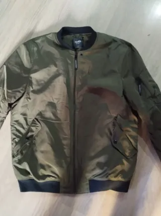 Vendo cazadora Pull&Bear en talla M, color verde. Está usada, pero por lo demás está en muy buen estado. Únicamente tiene el bolsillo derecho roto, aunque es un arreglo sencillo de costura. Es cómoda, versátil y perfecta para el día a día o para entretiempo. ¡Lista para seguir usándose!