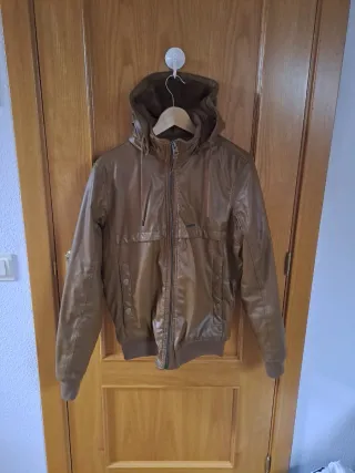 Cazadora con acabado que imita la piel, en un tono marrón. La capucha está unidad por botones, se puede quitar en el caso de que no se quiera. - Diseño con capucha. - Cierre de cremallera. - Bolsillos frontales con botones a presión. - Dos bolsillos interiores - Puños y bajo elásticos.