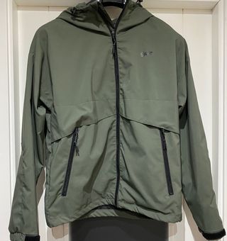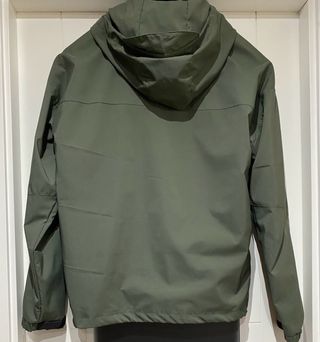 cremallera frontal, negra con detalle verde en el cuello. Varios bolsillos,uno con cremallera en la manga. Lava en lavadora y no precisa plancha, seca rápidamente.muy buen estado.