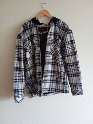 Cazadora de Pull&Bear de ma talla 38 con cremallera y capucha. Abriga bastante y se encuentra en perfecto estado. Es de cuadros firmados por líneas marrones y negras.