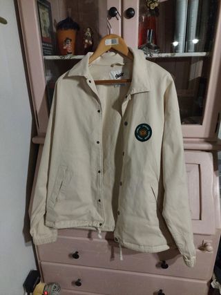 Chaqueta de loneta de algodón de la marca Stwd (Pull&Bear), en color beige y talla M (38-40 / 48-50). Dos bolsillos laterales. Puños ajustados con goma. Bajo ajustable con cordṕn. Cierre de botones a presión. Puesta dos veces. Solo reservo previo pago.