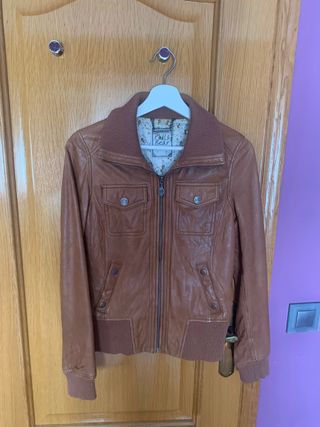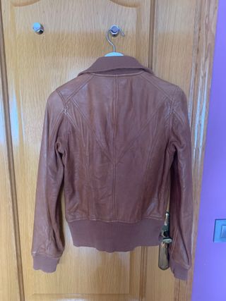 cazadora piel mujer talla S/26 color camel con puños y cintura elasticos de hombro a hombro 38cm-37 de cinturilla y 57 de largo