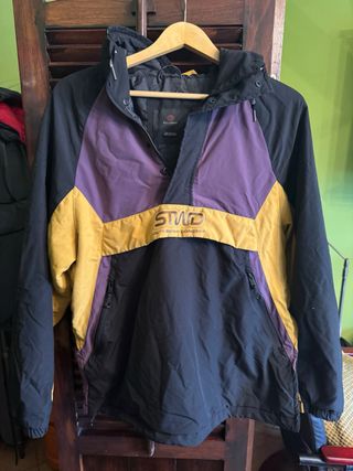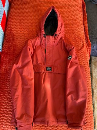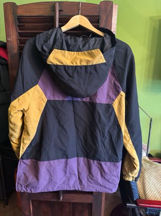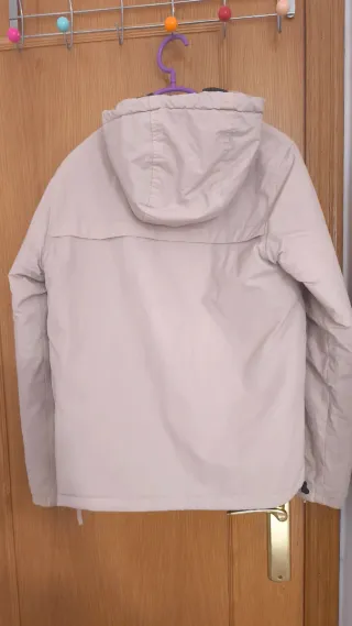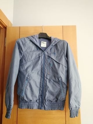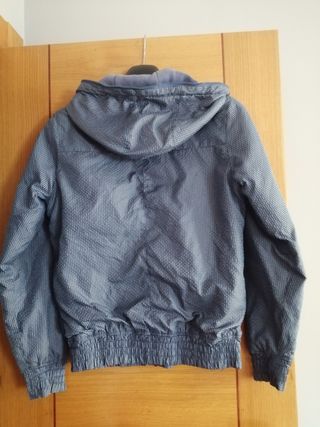 Cazadora con bolsillos, cremallera lateral y goma para ajustar la capucha. Tiene los puños un poco desgastados