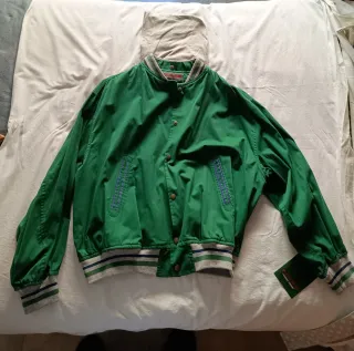 Cazadora de tela de estilo vintage de los años 90. Presenta un diseño clásico y cómodo. - Cierre de botones a presión. - Bolsillos delanteros con detalle de pespuntes. - Puños y bajo elásticos con rayas. - Cuello estilo bomber.