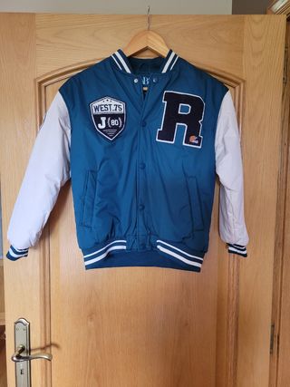 Bomber de niño de estilo bomber americana universitaria. Talla 10 o para 140 cm. Ideal para el día a día. - Las mangas son blancas y el cuerpo es un verde azulado. - Loa puños y cuello tienen detalles de rayas blancas. El cierre es mediante broches y tal como se ven en las fotos tienen 3 adornos, dos frontales y uno en la manga derecha. Su composición es 100% poliéster. La cazadora está nueva, casi sin uso. Solo tiene una pequeñita marca en la parte trasera de la manga izquierda ( tal como se puede ver en la última foto). El niño dió un estirón enorme y le quedó pequeña enseguida.