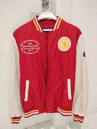 Cazadora estilo bomber en color rojo. - Cierre de cremallera frontal. - Bolsillo diagonal con cremallera en el pecho. - Dos bolsillos laterales con cremallera. - Puños y bajo elásticos.