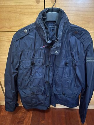 Cazadora de la marca Tommy Hilfiger en color azul. Ideal para entretiempo - Diseño con múltiples bolsillos frontales. - Cierre de cremallera. - Cuello alto. - Detalles de botones en hombros y puños. - Como nueva