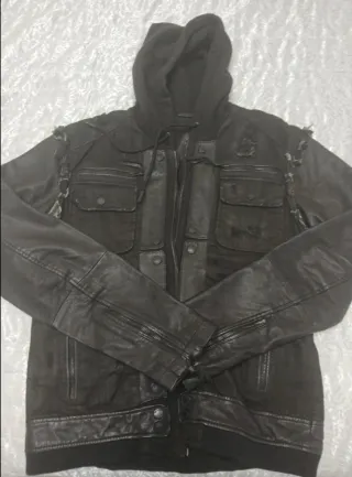 Cazadora bomber estilo motero con tejido efecto piel con costuras decorativas y capucha de felpa desmontable y ajustable. Con cuello tirilla, cierre y bolsillos con cremalleras, bolsillo interior, puños ajustables, y detalle de etiqueta metálica decorativa Nuevo, sin estrenar y con etiqueta. dos unidades; talla M y tall L