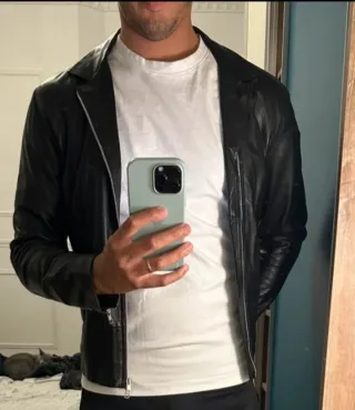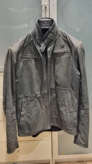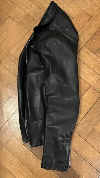 Chaqueta de cuero estilo motera de la marca REPLAY. Diseño moderno y atemporal. - Cuello redondo con cierre de botón. - Cremallera frontal. - Bolsillos con cremallera en el pecho y laterales. - Detalle acolchado en hombros y mangas. Puesta en contadas ocasiones, Precio nueva 590 euros no negociable, ya tiene un gran descuento.