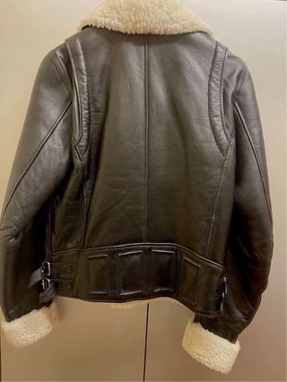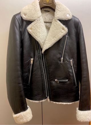Chaqueta motera de doble faz, de piel de oveja (shearling biker jacket) de la marca Diesel. Combina el estilo motero en el corte, con el abrigo de una chaqueta de aviador. El interior es de lana de oveja (borreguillo) y el exterior de piel de cordero. Robusta y calentita para el frio, ya que el forro de borreguillo cubre todo el cuerpo, el cuello y los puños. Presenta un cierre de cremallera asimétrica característico de las chaquetas moteras, bolsillos frontales con cremallera y correas de doble ajuste a cada lado de la cintura. Talla L de hombre de corte ajustado. Su estado es como nueva, no ha tenido ningún uso.