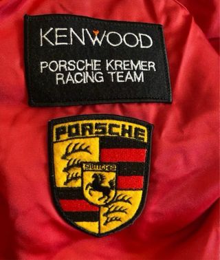 Cazadora Porsche Kremer Racing Team procedende del box Kremer en una carrera en Lemans. - Color principal rojo con detalles en azul marino. - Parches de Kenwood y Porsche Kremer Racing Team. - Chaqueta