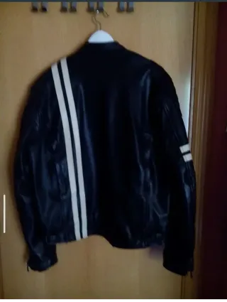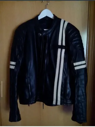 Cazadora de cuero con detalles en blanco. Un clásico para cualquier ocasión. - Diseño con rayas blancas en mangas y frontal. - Cierre de cremallera. La vendo por falta de uso. Está como nueva