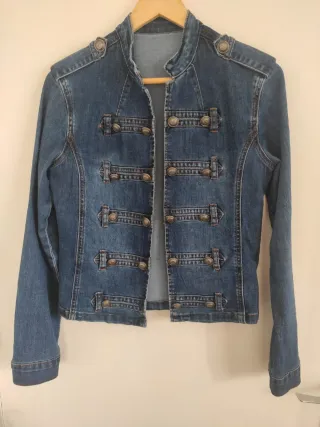 Cazadora vaquera de estilo militar para mujer. Un diseño único con detalles que marcan la diferencia. - Cierre de botones. - Detalles de botones en puños y hombros. - Corte entallado.