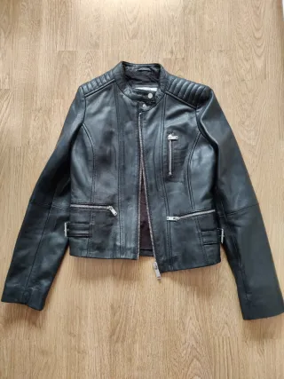 Cazadora estilo biker o rockera confeccionada en piel ovina, ligera y cómoda, casi sin uso, sin roces o desgaste. - Diseño con cremalleras. - Cuello redondo con botón. - Detalles acolchados en hombros y mangas.