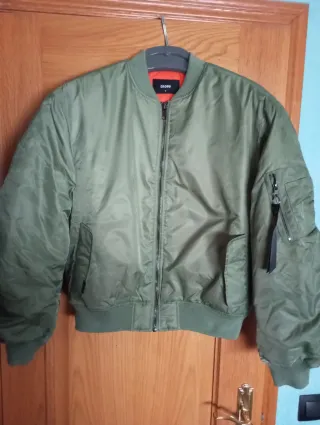 Chaqueta bomber marca Cropp en color verde militar. Usada pero perfecto estado. Talla S de hombre, da bastante talla, corte boxy / cropped fit. Interior acolchado naranja