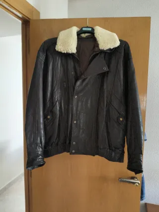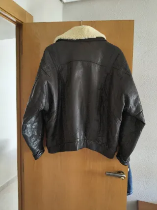 Cazadora bomber de piel color marrón. Talla XL o 2XL. Diseño unisex de finales de los 80. - Cuello removible borrego 100% lana. - Cierre de corchetes y cremallera - Bolsillos delanteros y bolsillos interior -bajo con pequeño defecto que muestro en fotos.