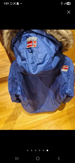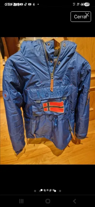 Cazadora de estilo anorak con un diseño llamativo y detalles distintivos. - Capucha con pelo sintético. - Bolsillo frontal grande con solapa. - Bandera de Noruega en el pecho. - Cremallera frontal parcial. - Puños ajustables.