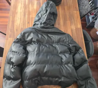 Cazadora acolchada con un moderno efecto cuero. Un solo uso. Nueva sin etiqueta. - Diseño con capucha. - Cierre de cremallera frontal. - Bolsillos laterales.