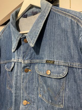 Clásica cazadora vaquera de la marca Wrangler.Años 70 - Cuello solapas largas y afiladas - Talla M grande o L - 4 Bolsillos - Cierre de botones metálicos. - Se entrega limpia. #levis