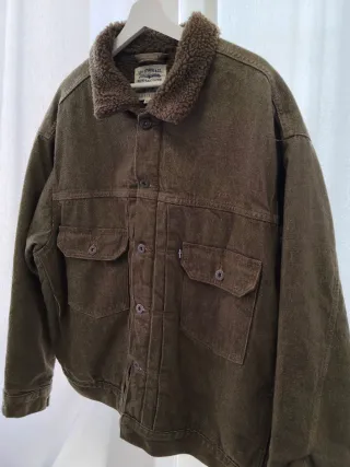 De la línea premium Made & Crafted de Levi’s, reconocida por utilizar tejidos y acabados de mayor calidad que la línea estándar. Modelo: 75505 (derivado del clásico Type III Trucker) Color: Moss Rock/Verde Oliva Talla: XL (fit estándar) Fabricada en Turquía Exterior: 100% algodón orgánico Parte superior: forro tipo sherpa Parte inferior y mangas: forro acolchado Silueta estructurada Type III con herrajes mate y color Moss Rock de temporada. Compré nueva en 2022 y pagué 200 €. Usada solo cuatro veces. Como nueva.