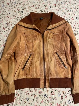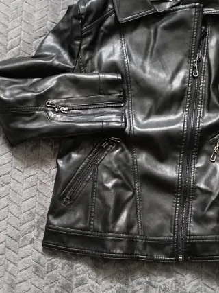 Cazadora de polipiel con cuello redondo y detalle de pespuntes en los hombros. - Cierre de cremallera frontal. - Bolsillos laterales con cremallera. - Puños con cremallera. Tiene qlgun desperfecto como se aprecia en las ultimas fotos