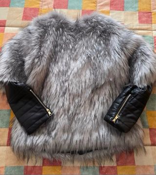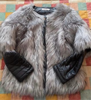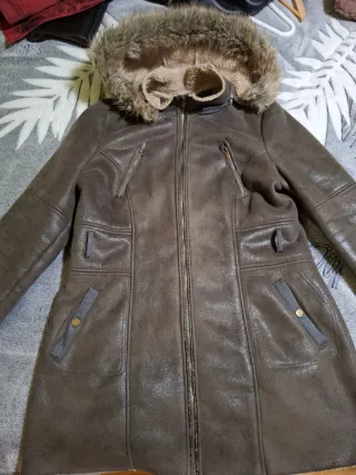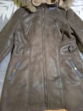 Cazadora de polipiel con capucha de pelo sintético. - Diseño moderno. - Cierre de cremallera. - Bolsillos con cremallera. - Detalle de solapa en bolsillos. Es una talla 44 pero tambien vale para una 42