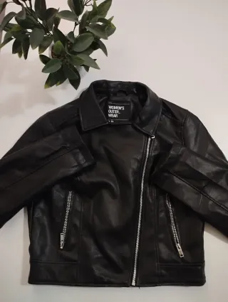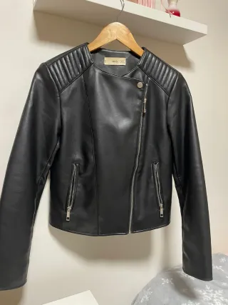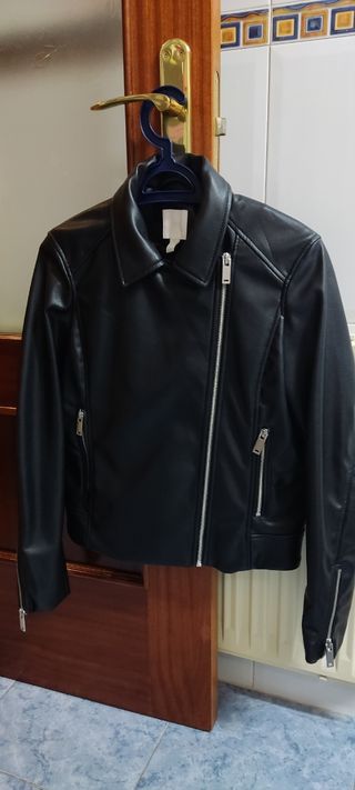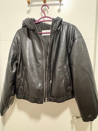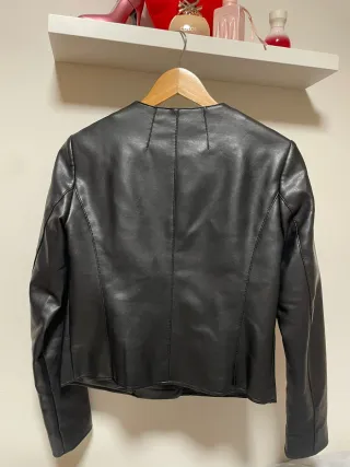 Cazadora de polipiel negra, marca Zara, talla S, unisex.