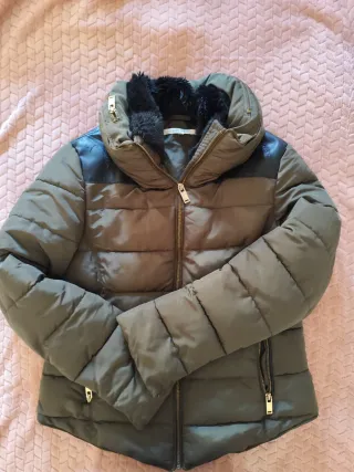 Cazadora acolchada de mujer en color verde. Presenta detalles en polipiel negra y cuello con pelo sintético. Le falta el gorro que se lo quité. Como se ve está usada porque sienta muy bien. Por eso su precio - Cierre de cremallera frontal. - Bolsillos laterales con cremallera. - Puños ajustados.