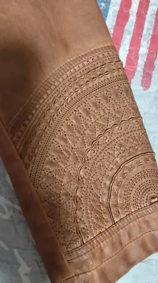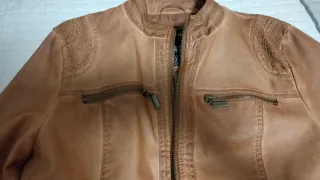 Cazadora estilo motero en polipiel de color mostaza nueva nunca usada.lo único defecto que la piel en el cuello un poco dañado por eso el precio - Cierre de cremallera. - Bolsillos frontales con cremallera. - Cuello solapa.