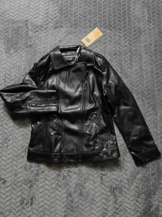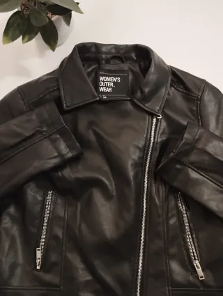 Cazadora de polipiel con un diseño moderno y elegante. - Cuello redondo. - Cierre asimétrico con cremallera. - Bolsillos frontales con cremallera. - Detalle de costuras en hombros y cintura. - Corte peplum en la parte inferior. Tiene algun desperfecto como se puede ver en las fotos