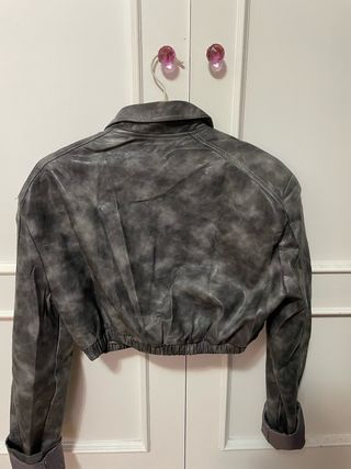 Cazadora de polipiel entallada, con un diseño moderno y elegante.Tiene desgaste en el cuello por dentro. - Cuello redondo con cierre de botón. - Cremallera frontal. - Bolsillos laterales con cremallera. - Detalle acolchado en los hombros.